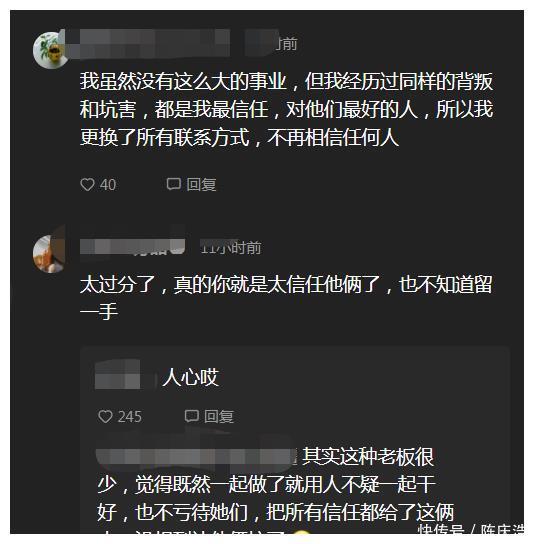 网友们看到了游絮的声明,纷纷发言,果然是狠东说念主。把雇主给炒了,城市套路深啊。 有个网友称:我天然莫得这样大的干事,但我资历过相似的叛变和诬害,皆是我最信任,对他们最佳的东说念主,是以我更换了统共关系神气,不再笃信任何东说念主。       信任真的是错么?代入一下,其实10年前我本东说念主要遭逢了叛变,看到这个事情,挺伤感的,叛变者的日子可能过得红红火火,但是被叛变的东说念主却要破耗多年时光调理心态,每当现时回来旧事,我仍然不休唏嘘。